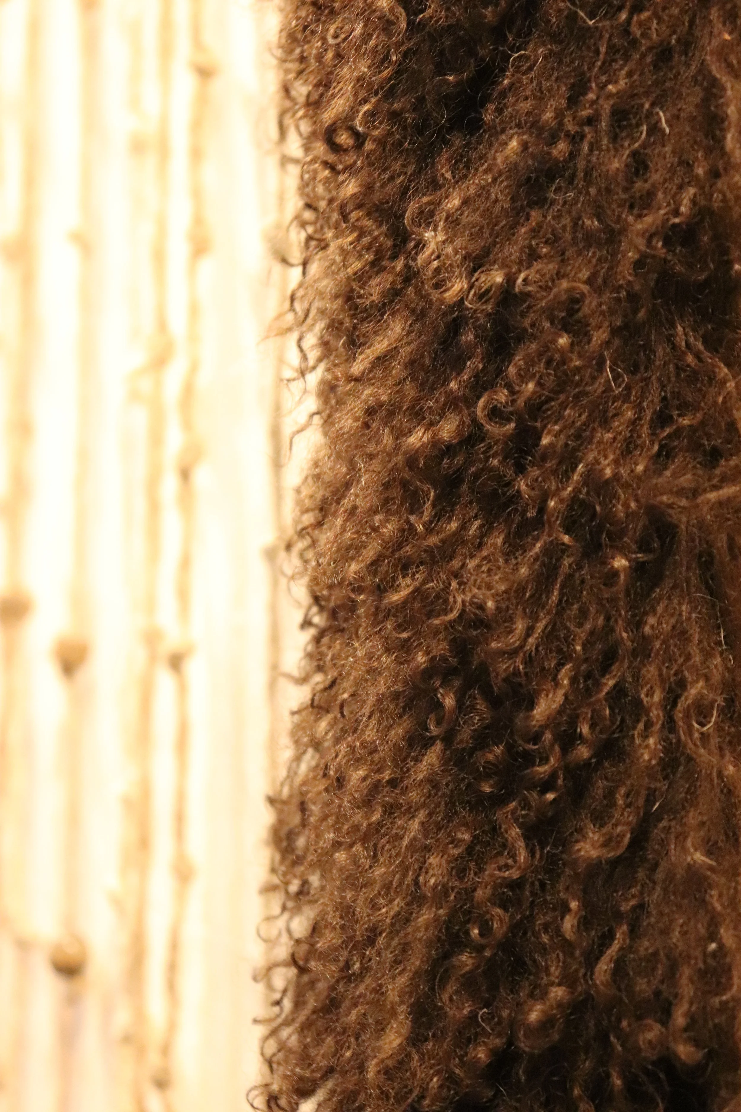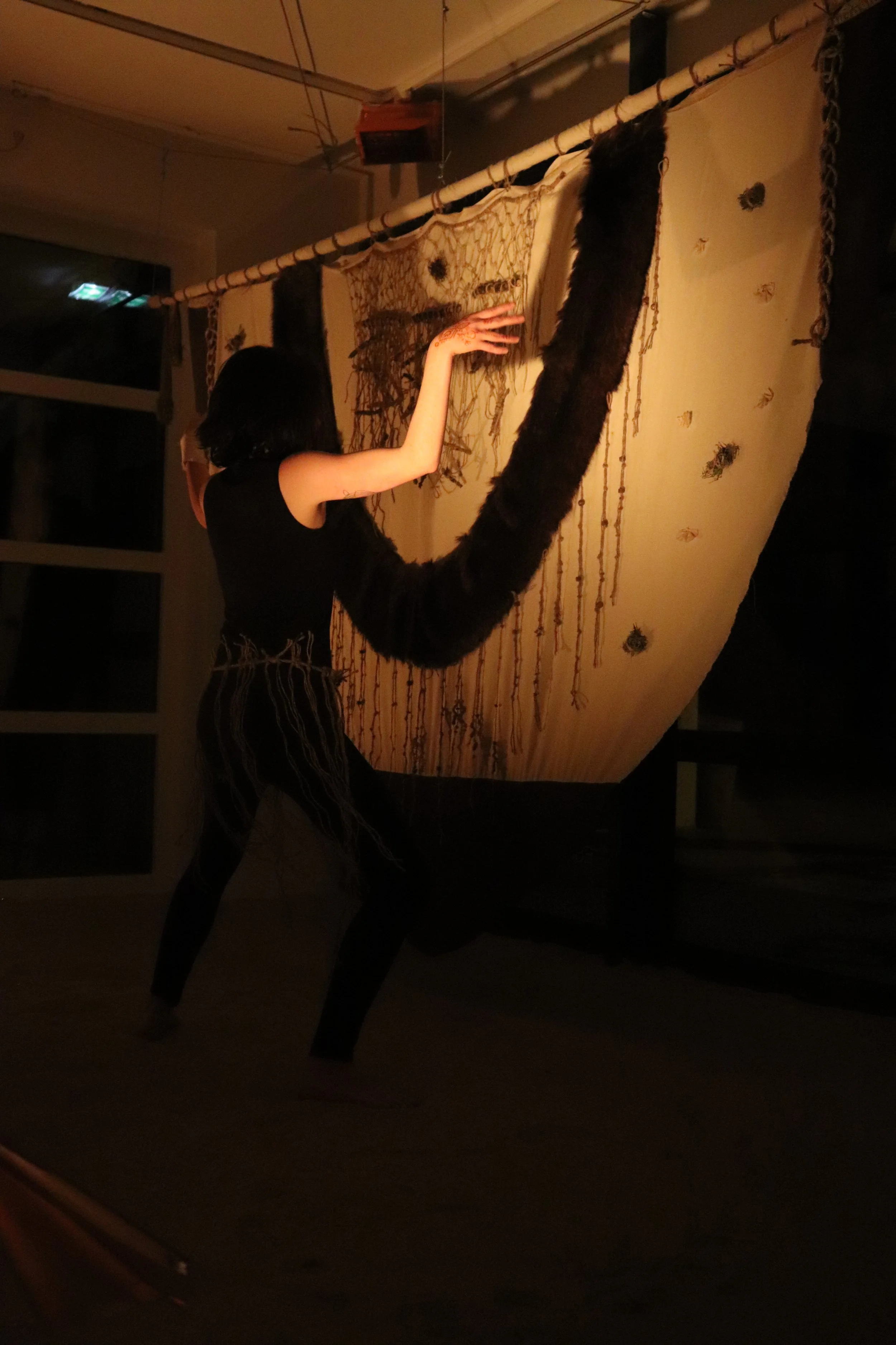 The two large pieces, measuring three meters by one and a half meters, are inspired by the Chador, the traditional veil worn by Muslim women. The shape of this garment served as the foundation for creating a structure where disparate objects are arranged in surprising ways. Fur, ropes, eggs, moss, and medicinal plant sprouts are among the visible elements on these pieces. The Chadors are used here to transform a traditional garment into a magical canvas.