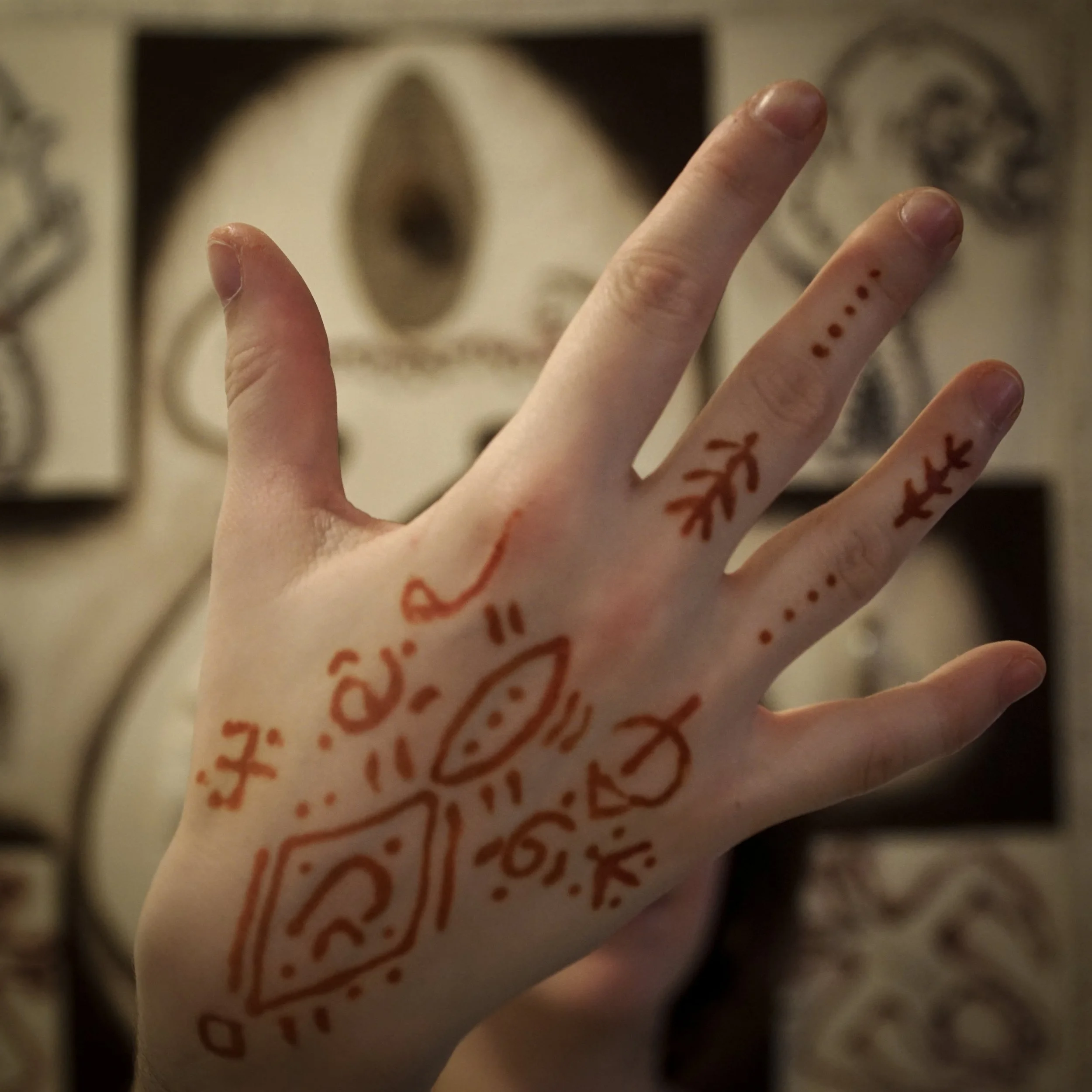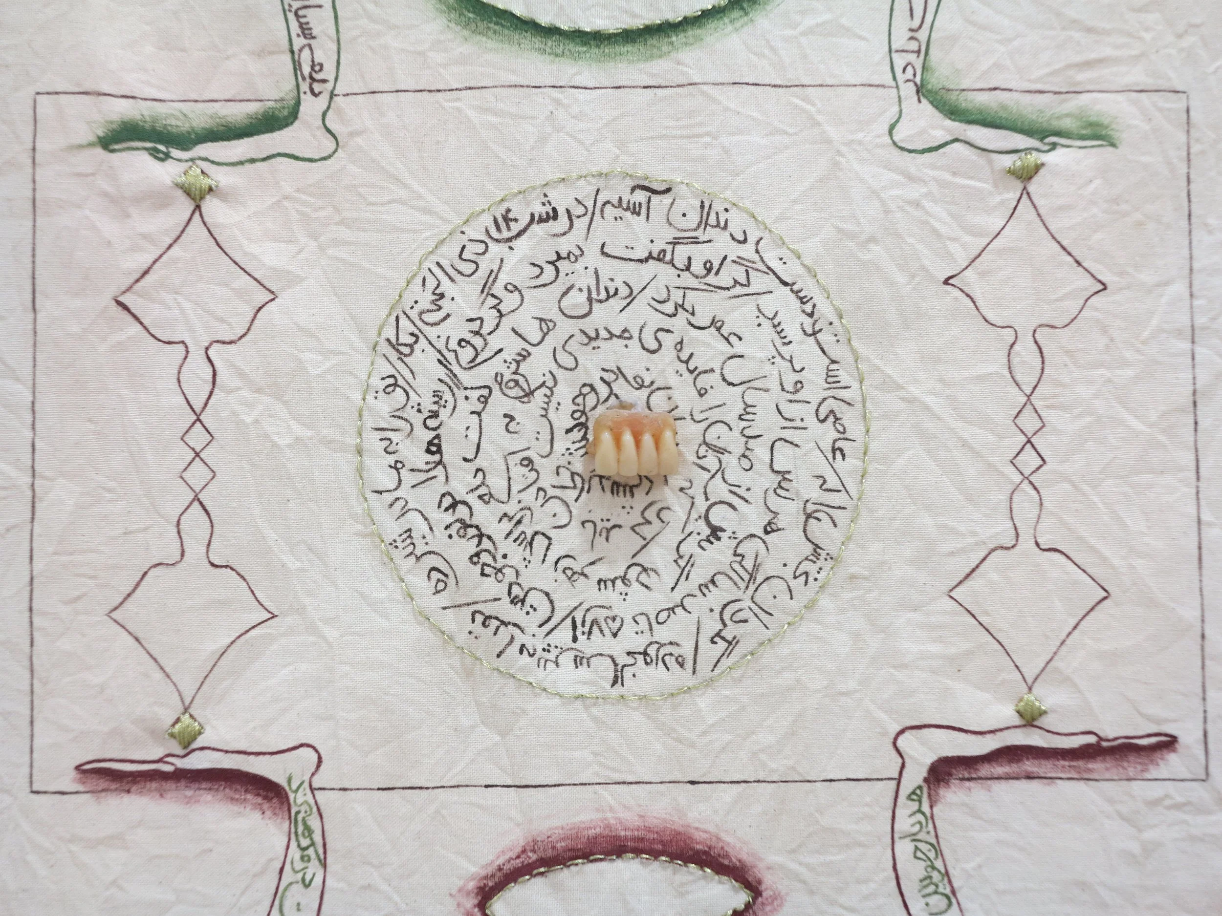 The smaller pieces on display are inspired by the aesthetics of talismans used in Iran. Their visual quality is marked by the coexistence of writing and drawing. Typically, the shapes illustrate the effects of the talisman, while the writings are excerpts from the Quran and the secret language of numbers. In my works, the drawings depict fictional demons, and the writings are texts related to current events in Iran. The pieces thus become talismans intended to resolve contemporary issues.