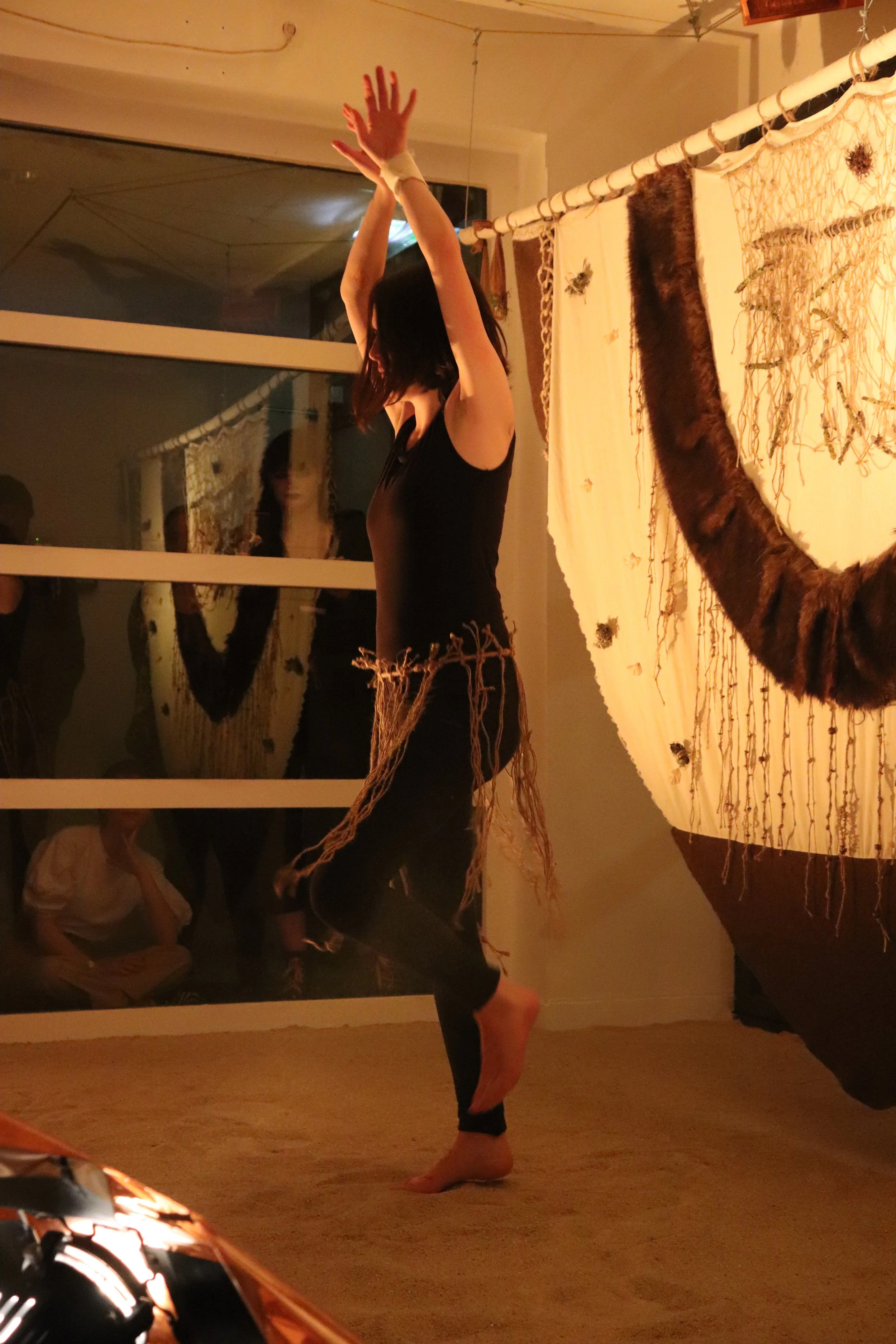 In addition to the pieces displayed in the exhibition space, a performance, a soundtrack, and an artist's book were created for the event. To create a cohesive atmosphere, yellow lights were installed throughout the exhibition space. The floor was covered with nearly five hundred kilograms of sand. The large pieces were set up to be mobile, allowing space for performances. Viewers were invited to move around and experience the space up close.