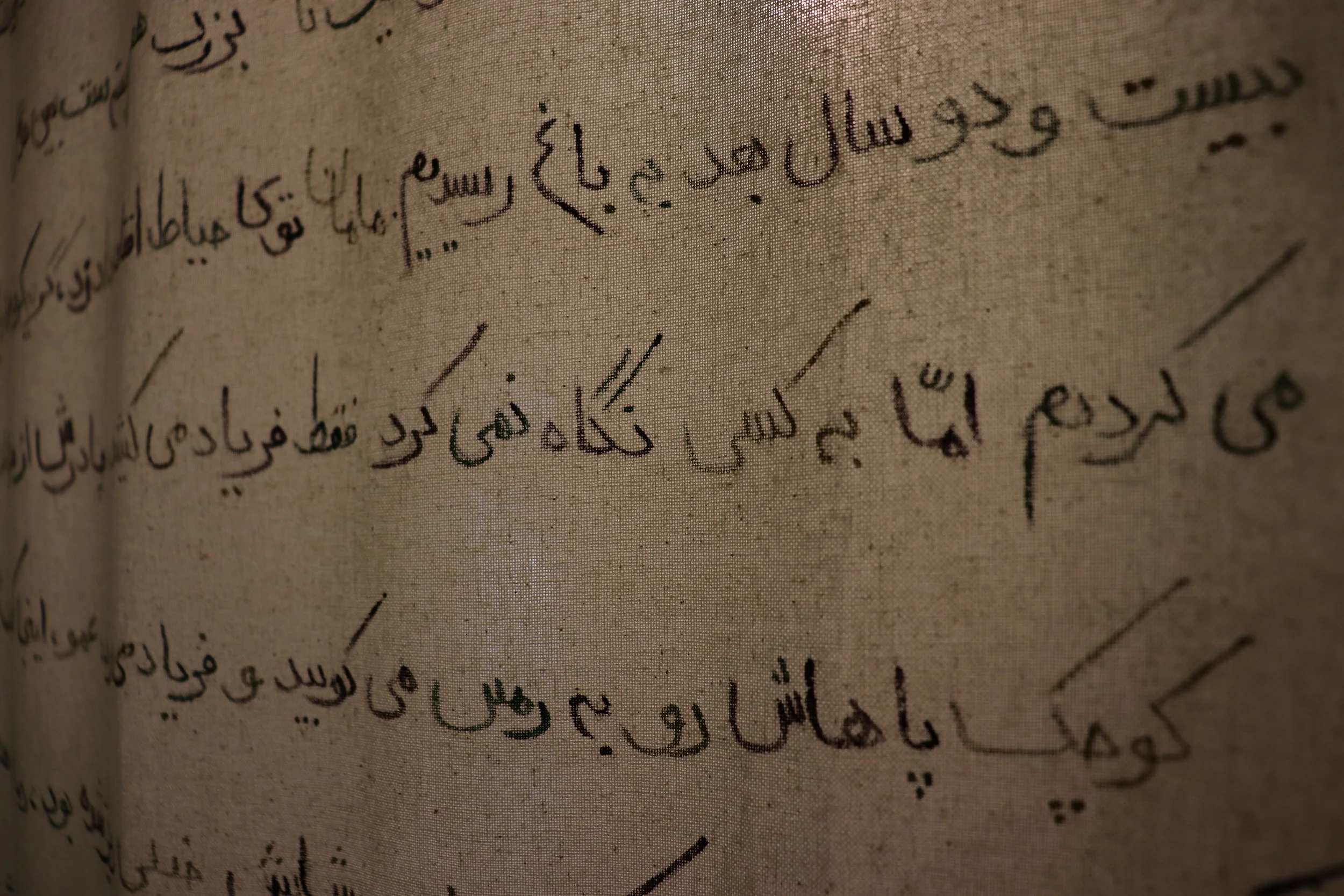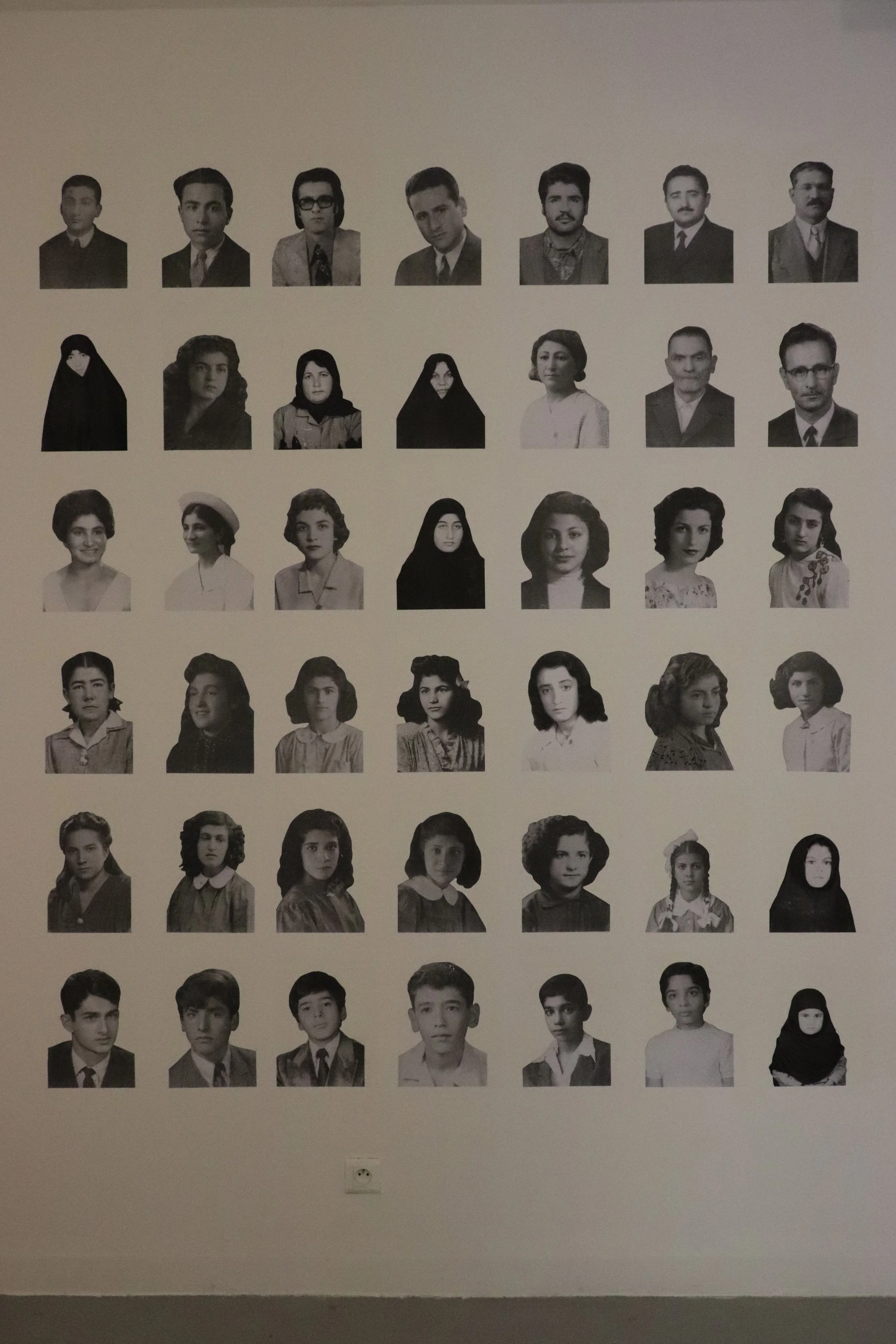 Nour consists of a wall of portraits and three pieces, each 250 cm long and 70 cm wide. On each of these pieces are the memories of a woman who left her country, coming from Iraq, Iran, and Afghanistan. Each memory is written in its original language on the canvases and illustrated with drawings and archival photos, attempting to reconstruct traces of a distant reality. A lighting system randomly illuminates a photo from each memory.